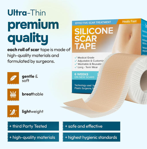 Silicone Scar Tape Reusable Sheets (120” x 1.6”) Medical Grade Silicone Scar Sheets for Surgical Scars, Burns, Tummy Tuck, Keloid, C-Section - Cut to Size Scar Treatment