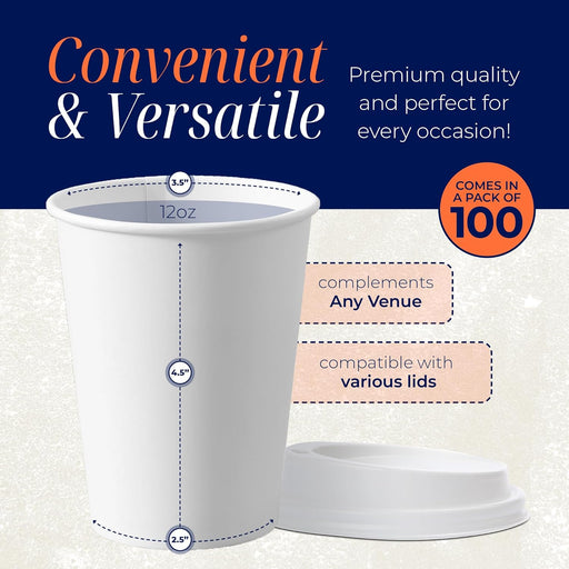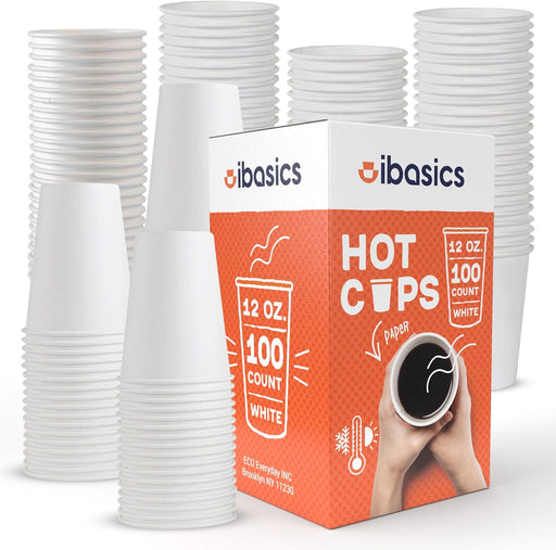 IBASICS 12 oz Coffee Cups - Case of 100 Disposable Hot Cups | White Paper Cup for Beverages | Ideal Paper Coffee Cups for Office, Events | Durable Paper Cups 12 oz Size for Hot Drinks