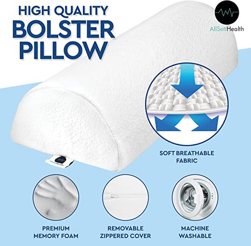 AllSett Health Large Half Moon Bolster Pillow for Legs, Knees, Lower Back and Head, Lumbar Support Pillow for Bed, Sleeping | Semi Roll for Ankle and Foot Comfort - Machine Washable Cover, White